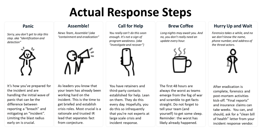 - Be relatable: You will lose the audience quickly if you are not talking at their level. I often use a slide like this one below to demystify the often way too technical IR plan: