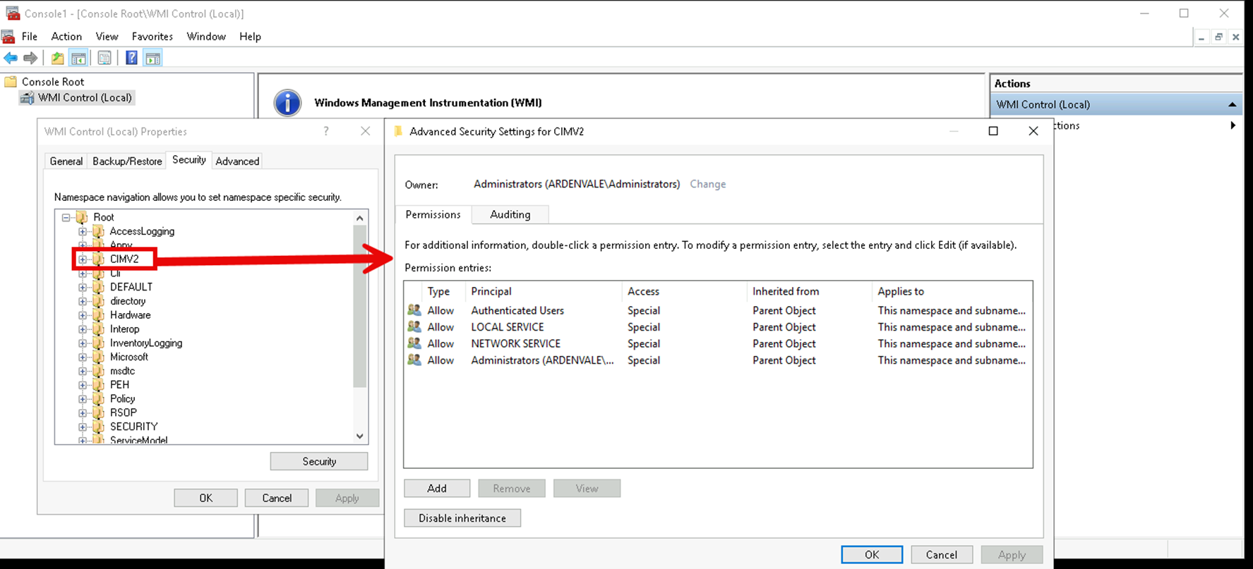 Viewing the CIMV2 namespace security descriptor in WMI Control