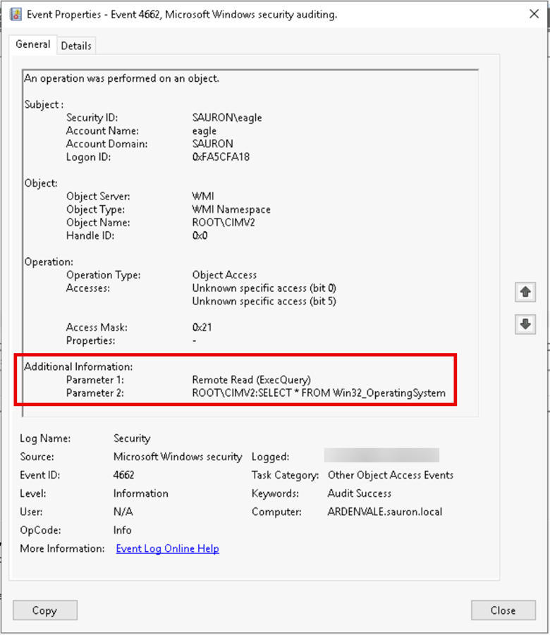 Example audit event for remotely retrieving OS information via WMI