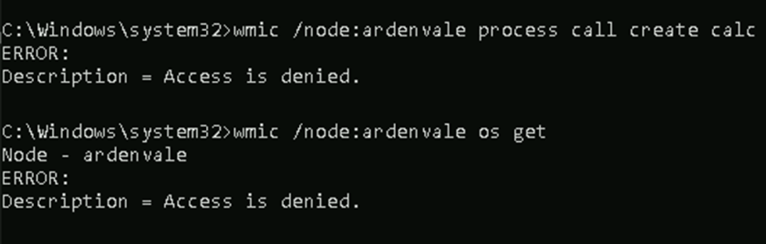 These descriptors should provide more granular control for specific actions. However, in our testing, they did not affect a remote user’s ability to interact with WMI (e.g. creating a process on a remote machine). They are, however, still useful for auditing. The SACL component of the descriptors are honored when actions are performed against the namespace. By configuring a SACL on the root namespace (or select namespaces under the root namespace) then using Windows Advanced Auditing policies you can gain additional insight into the WMI activity via object access logs. NXLog provides a useful guide for configuring WMI auditing here: https://nxlog.co/news-and-blog/posts/wmi-auditing.